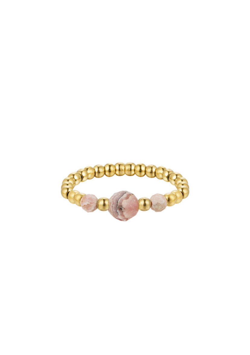 Deze handgemaakte ring is gemaakt van elastiek en versierd met hematiet, kristalkralen en rhodochrosiet. Een liefdevolle combinatie die harmonie, bescherming en openheid brengt.