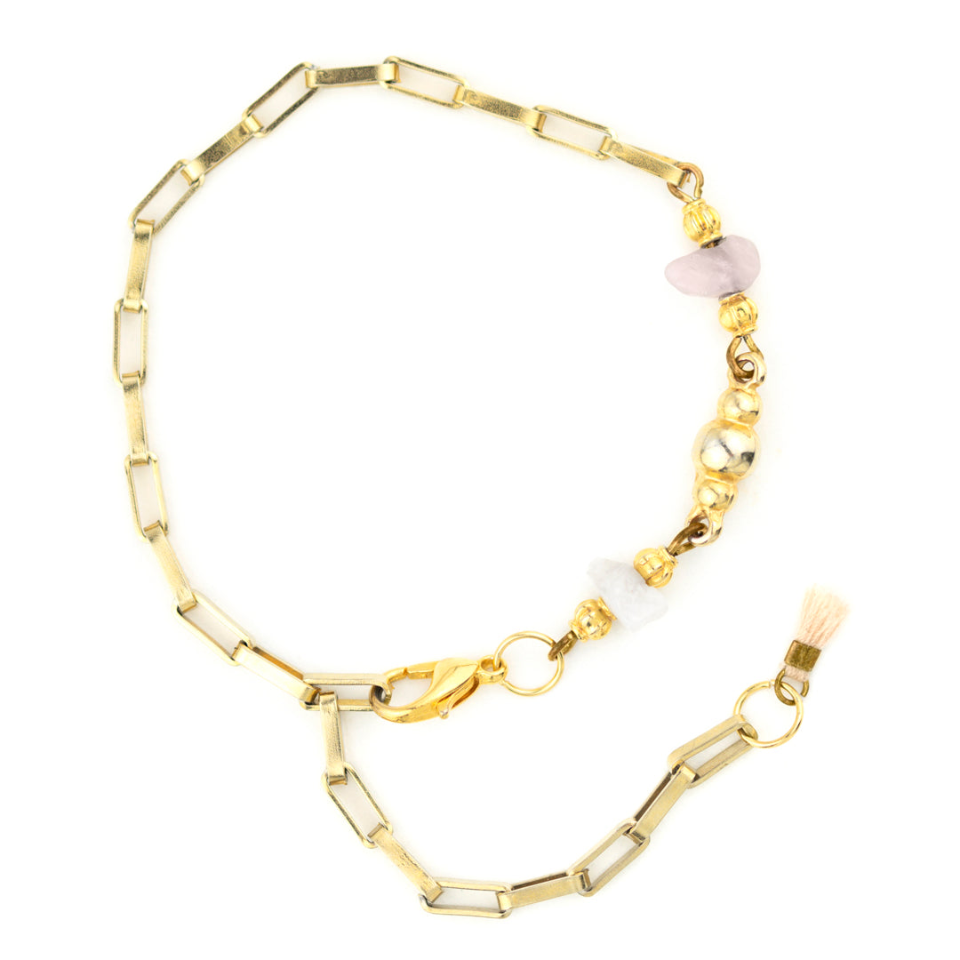 Deze handgemaakte armband van stainless steel is versierd met twee rozenkwarts stenen – de steen van liefde in al haar vormen. Rozenkwarts trekt harmonieuze relaties aan, opent het hart voor verbinding en stimuleert eigenliefde en zelfacceptatie. Subtiel, krachtig en prachtig te combineren met andere sieraden voor een persoonlijke touch.