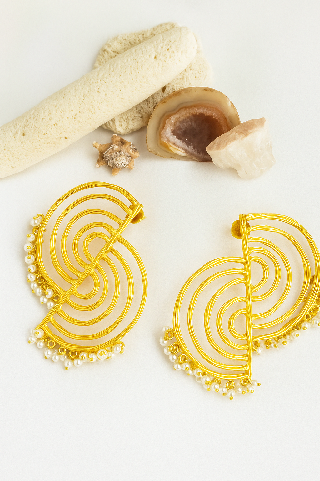 Deze handgemaakte oorbellen zijn geïnspireerd op de vloeiende lijnen van een schelp, met een moderne twist. De ronde vormen staan symbool voor oneindigheid en beweging, terwijl de verfijnde parels langs de rand zachtheid, wijsheid en innerlijke kracht belichamen. Een subtiele herinnering dat ware schoonheid van binnenuit groeit – elke dag opnieuw.