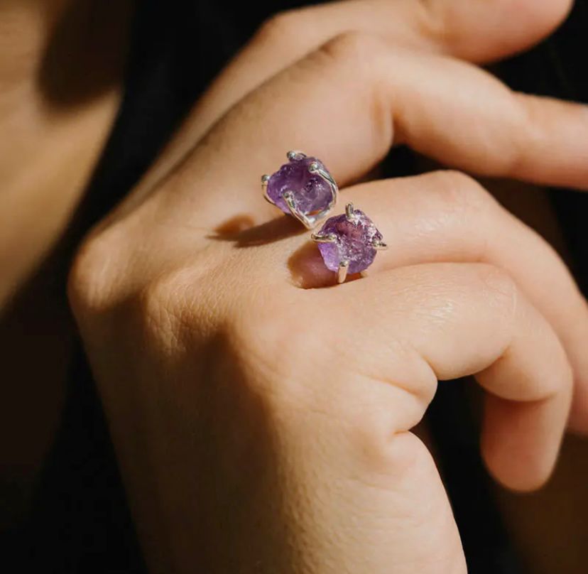 Deze open ring met twee ruwe amethiststenen straalt rust, helderheid en innerlijke kracht uit. Amethist staat bekend om haar beschermende en kalmerende werking en helpt je om bij jezelf thuis te komen. Handgemaakt met aandacht en liefde, ontworpen om je dagelijkse momenten van balans te herinneren.